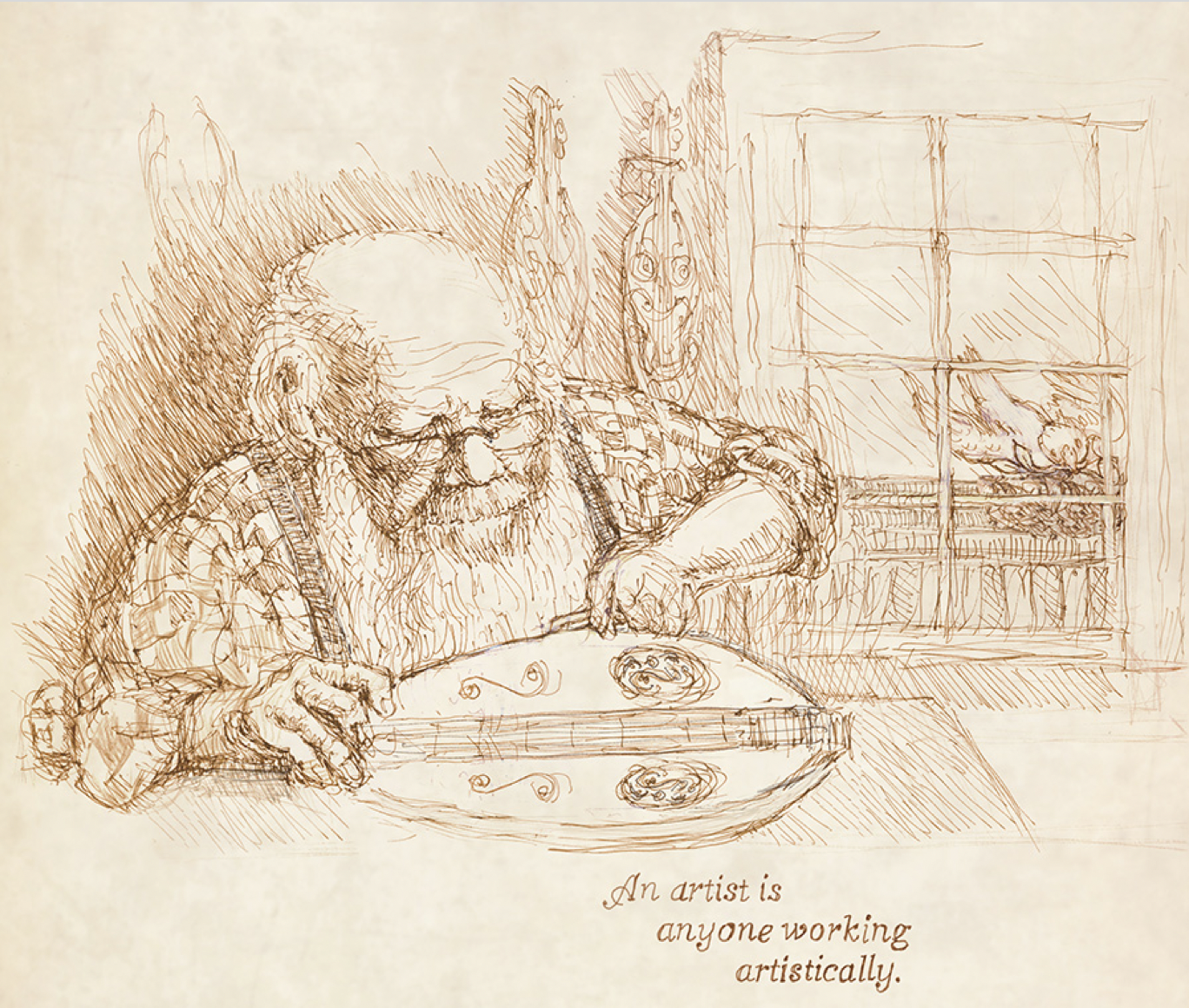 The studio is a rococco profusion of large-leaf plants, ornatelycarved furniture, sculptures, masks, costumes and a phantasmagoric array of whatnots and doodads. Hand-painted lampshades and fanciful light fixtures of strange devising dangle from the ceiling alongside Casablancan propeller-fans, as does a three-foot pterodactyl (a functional kite) with a maiden dangling from its beak, and a delightful DaVinci-like airplane fashioned out of twigs and leaves.
